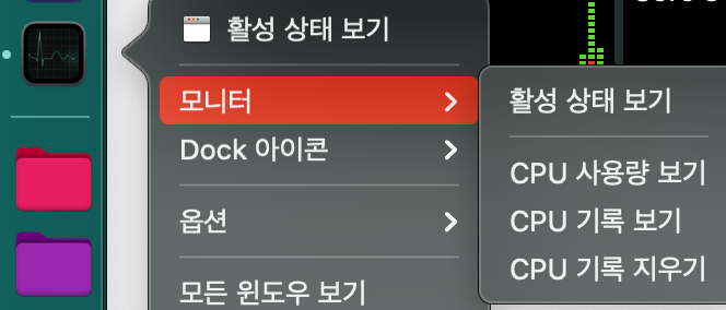 활성 상태 보기의 앱을 우클릭해 보면 아래와 같이 메뉴가 나오는 걸 확인할 수 있는데 모니터에서 CPU 사용량 등 눌러보면 따로